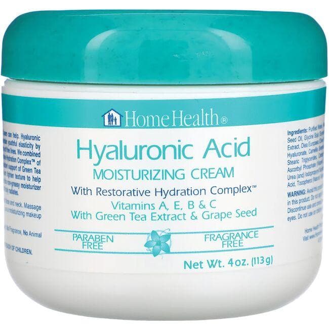 Promote healthy skin with Hyaluronic Acid Moisturizing Cream from Home Health. Hyaluronic acid is naturally found in skin, where it maintains elasticity by trapping moisture. Home Health's cream features a specially formulated Restorative Hydration Complex with nourishing botanicals, including green tea extract and grape seed oil. Hyaluronic acid products have rejuvenating vitamins that improve skin texture and radiance. Gentle enough for all skin types, this moisturizer absorbs quickly. No parabens, petroleum, artificial color, fragrance, animal products or gluten.